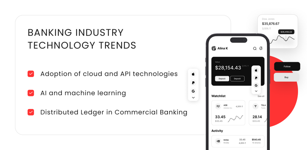 - Some of the most noticeable trends in custom banking software development include the rise of super apps and non-card payment options, fast adoption of cloud and API for banking and fintech applications, implementing AI and ML for a wide range of financial operations, and putting the emphasis on information security and compliance requirements.