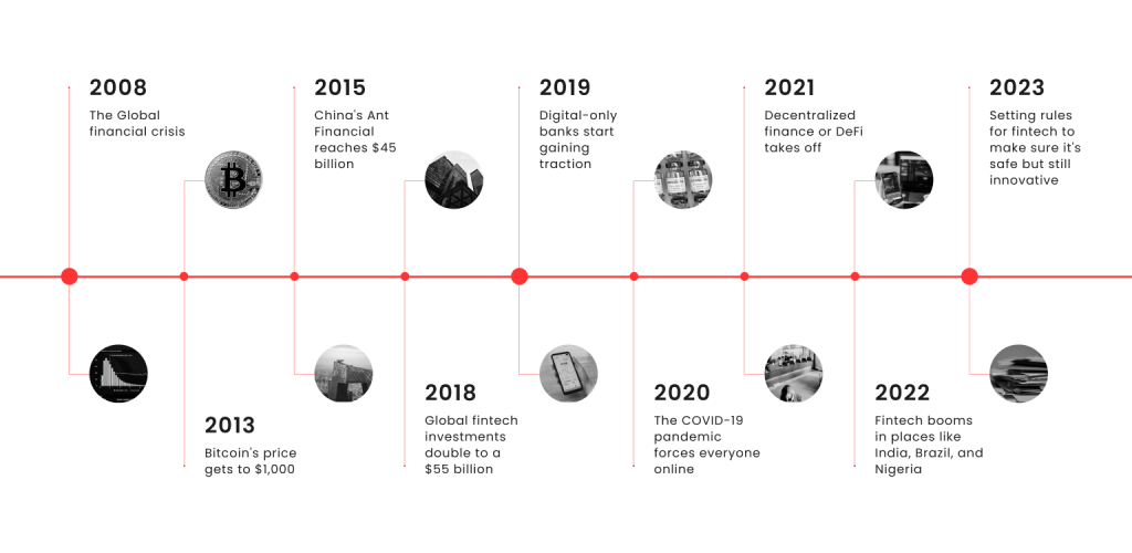 - 2022. Fintech booms in places like India, Brazil, and Nigeria. New startups and apps pop up, giving many people their first taste of the modern financial landscape, bridging the gap left by traditional banks.