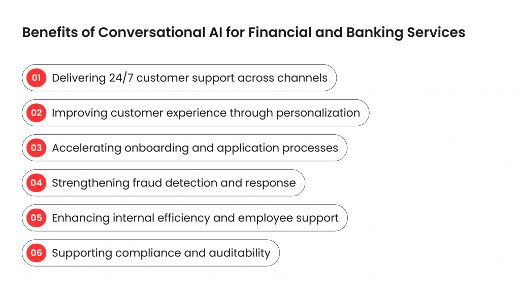 Modern conversational AI isn’t limited to customer support. Banks now use it to improve loan application experiences, provide financial advice, assist frontline employees, streamline internal service desks, and more. Its ability to reduce operational costs while improving service quality makes it a key driver of digital transformation.