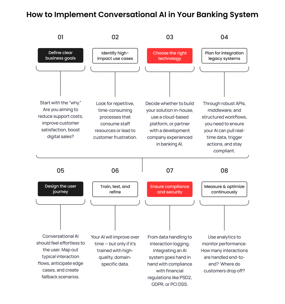 Rolling out conversational AI isn’t just about deploying a chatbot — it’s about rethinking how your bank communicates, operates, and serves its customers. A structured, business-led implementation roadmap is critical to the long-term success of a digital banking platform. Here are the steps you need to make to ensure success in integrating conversational AI in your customer-facing processes.