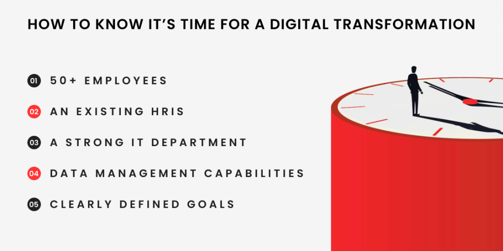 - An existing HRIS. As we’ve covered earlier in our article, the HR digital transformation is not the beginning of a digital journey — it’s merely an important milestone. In order for the transformation to be successful, the company needs to have a robust HRIS in place and already manage digital employee data that will then be transferred to the new software.