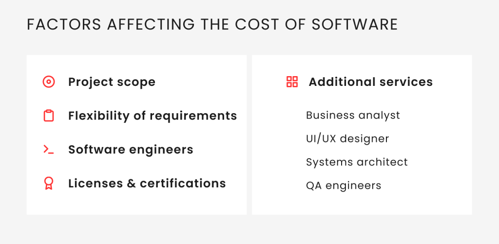 - Human resources. The importance of engineers to a software development project needs no explanation: these people are the ones responsible for the quality of the software and the project being completed on time and in full. Considering the aspect of cost, it’s worth mentioning that it’s not just the size of the team that will determine your expenses, but also the specialty and seniority level of the team.