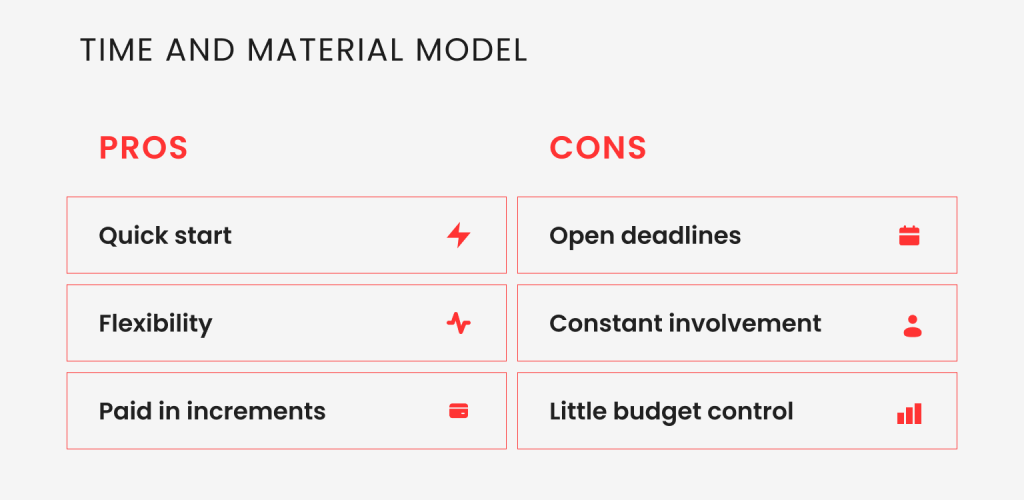 - Managing client expectations. Both fixed cost and T&M models have their fair share of fans thanks to their unique selling points: predictable budget and absolute flexibility, respectively. Mixing the two models can lead to some clients expecting the flexibility of the time and material model on a strict budget of the fixed cost model. The vendor will need to invest extra effort into making sure the client’s expectations are aligned with the actual project specifics.