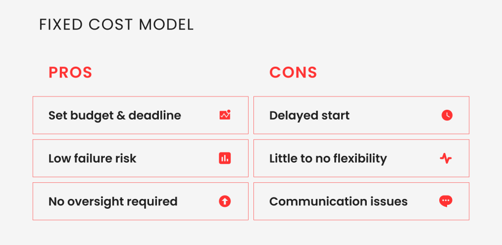 - Predictable budget and deadlines. One of the biggest benefits of the fixed cost pricing model is a combination of clear deadlines and a set budget. In other words, with careful planning, you can know exactly how much your project will take in terms of financial and time resources, and will be able to better outline other steps related to bringing your idea to life.