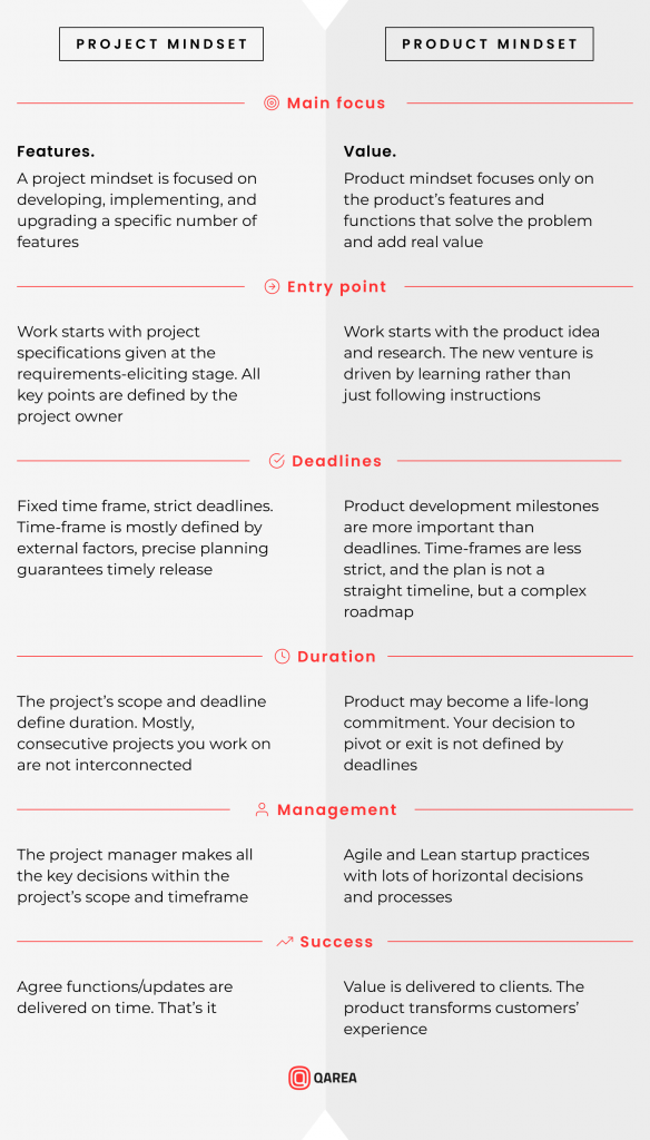 Responsibility and commitment are key differences when it comes to project vs product mindset. Project mindset gives all the agents small responsibility at the predefined playground. It is fully focused on deliverables, time and budget, aiming to crossing all the “to-dos” when in the scope of development and updates. Success is defined by certain activities are done in certain time, and the planned features ready within the sequence of codependent deadlines.