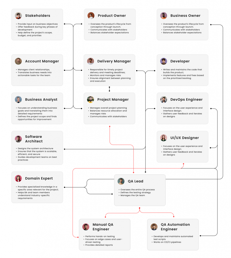 However, before we move to the details, let’s first take a glimpse at the team’s structure. This will give you an idea of the key software development team roles usually involved in an average project and how they are all connected.