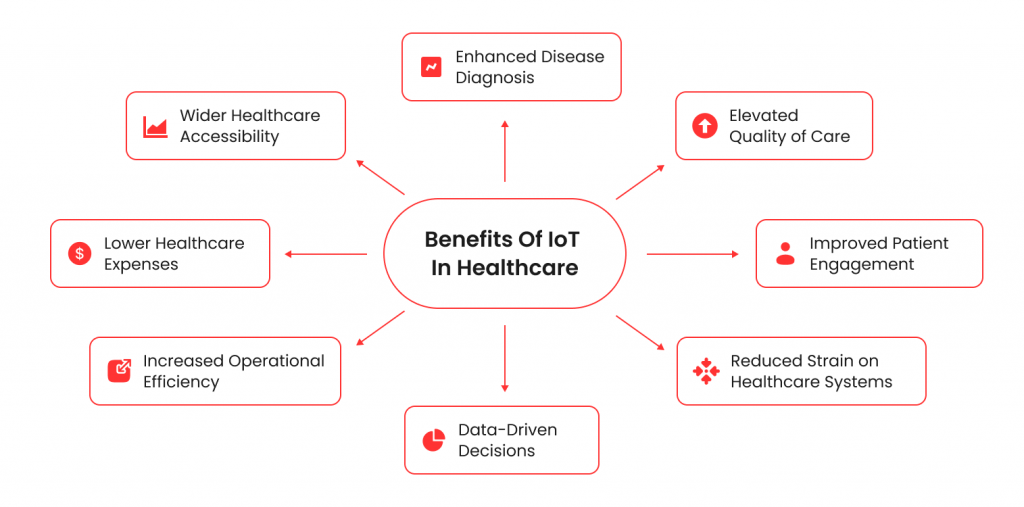 - Using IoT appliances in healthcare brings on a sizable number of benefits, including more precise diagnosing and efficient care, better patient engagement, higher operational efficiency, lower operational costs, and increased patient reach for hospitals.