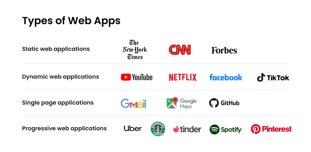 There are different approaches to categorizing web apps. You can categorize them based on their purpose, architecture, and other characteristics. Here are the most popular types of web applications and their uses.