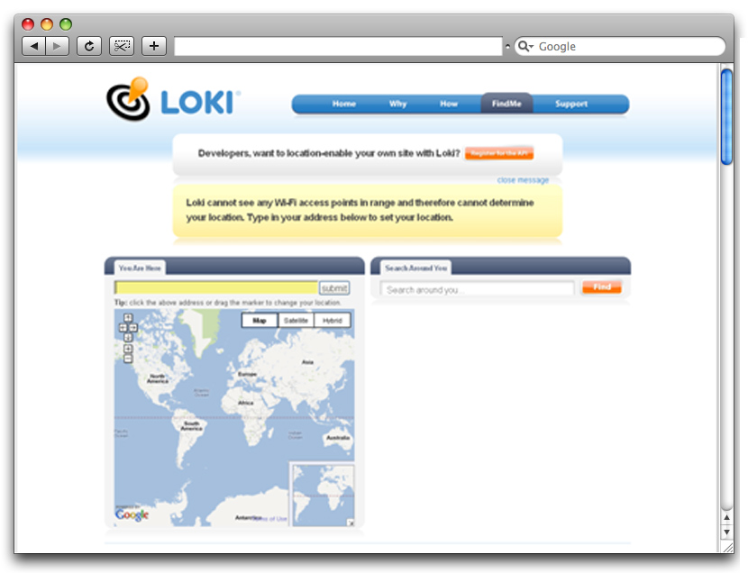 FindMe page demonstrates the power and preciseness of Skyhook’s technology. Users can view/set their location and try all available channels there.